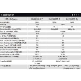 Serie "EG"/ "EGL" sind speziell für die Bedürfnisse des Elektrosegelflugs konzipiert. Die kleinsten Typen eigenen sich hervorragend die F5K, R.E.S, P5B u.ä. Anwendungen. Motoren mit langer Motorwelche für vorbildgetreue Segelflugmodelle sind ebenso erhältlich, wie Motoren im gekapselten Gehäuse für besonders schmale Rümpfe. "XM2833EGL" weist als Besonderheit eine Wellen-/Motorverlängerung in Form eines Getriebegehäuses auf. Dabei ist jedoch KEIN Getriebe integriert. Es dient lediglich dem vereinfachten Einbau in ultraschmalen Rümpfen.