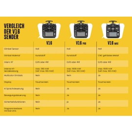 Die V16 MAX wird mit einem internen 4N1 HF-Modul angeboten. Das 4N1 Multiprotokoll Funksystem beinhaltet die HF-Chips NRF24L01, CC2500, A7105 und CYRF6936. Es ist kompatibel mit HoTT, Futaba SFHSS, FrSky, DSM/DSMX, Walkera Devo, FlySky, AFHDS2A, Hubsan, HiSky, Syma und ASSAN Protokollen.