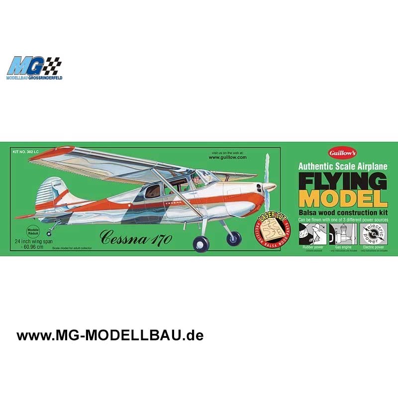 Die Cessna 170 ist ein Voll-Metall-Lichtflugzeug, das unter privaten Flugzeugfliegern breite Akzeptanz gefunden hat. Schlank und robust, der 170, ist ein echtes Arbeitspferd der Luft, voll angetrieben, um eine vollständige Ergänzung von Passagieren und Gepäck zu handhaben. Dieses Guillow-Modell vereinigt die von allen Modellfans geschätzten Realismus, einfache Montage und die Flugstabilität.