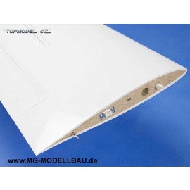 - Fertige Flügel aus Schaumkern und Abachi-Holz mit Carbonfaserverstärkung, überzogen mit aufbügelbarer Folie, mit bereits installierten metallischen Bremsklappen und Querrudern