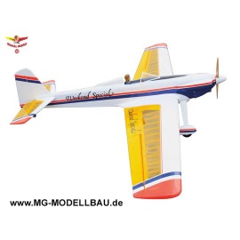 - Umfangreiche Zubehör mit CFK-Servoabdeckungen, GFK-Ruderhörner, Anlenkungen, Kevlarseile, fertig vorgebogene und abgelängte Federn für Höhe und Seite