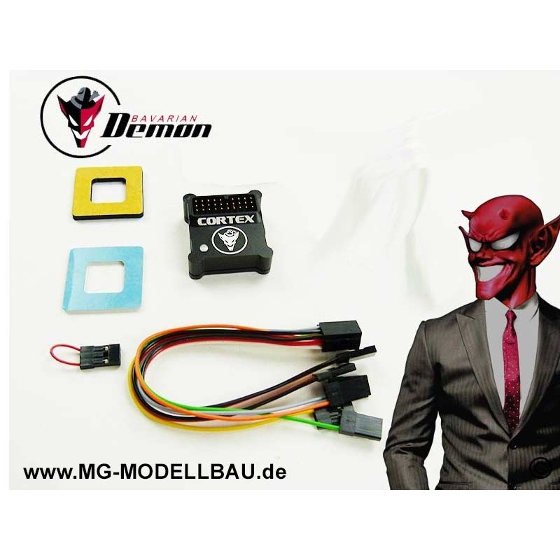 Der CORTEX von bavarianDEMON ist ein Stabilisierungssystem für Flug- bzw. Flächenmodelle. Und damit in dieser Form eine absolute Weltneuheit. Das neue Hirn und Herz Deines wertvollen Fluggerätes - und das sofort ready to run. Der CORTEX benötigt keinen PC bzw. zusätzliche Softwareeinstellungen - außer es wird gewünscht. Er unterstützt 2 Querruder, 2 Höhenruder und ein Seitenruder. Sowie unterschiedliche Empfangssysteme wie S-Bus (Eingang), 2 Spektrum Satelliten, PPM Summensignal und Kabelbaum. Der CORTEX kommt mit Sensoreinheit, Anschlusskabelbaum, Klebepads, USB-Anschlusskabel, und exklusivem Design- und Infomaterial von Deinem Lieblingsdämon. Software- und Firmware-Updates gibt es bequem per Web. Das wichtigste aber ist der Demon inside. Denn der bedeutet puren Flugspaß bei größtmöglicher Sorglosigkeit. Keine oder kaum mehr Zusatzausgaben durch Crashs. Mit dem CORTEX trainiert man schneller, wobei der einstellbare Haltegrad hilft. Aber auch und vor allem für die erfahrenen Piloten oder Dämonen unter Euch ist der CORTEX ab jetzt unverzichtbar.