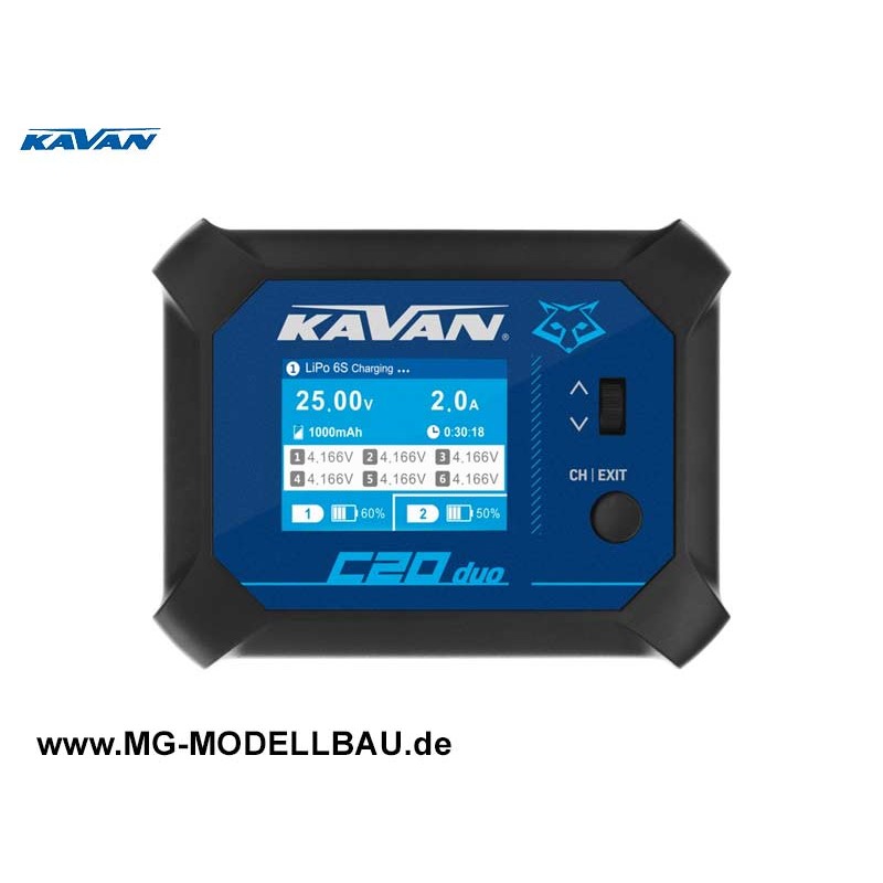 Das kleine 2-Kanal-Ladegerät KAVAN C20 Duo ist ein intelligentes Ladegerät mit Netz- wie auch Autobatterieversorgung und einer sehr einfachen und übersichtlichen Bedienung. Mit KAVAN C20 Duo können Sie übliche Zellentypen (NiCd, NiMH, LiPo, LiHV, ULiHV, Li-ion, LiFe, Pb) laden. Das Ladegerät ist darüber hinaus mit eingebauten 6-Kanal-Balancern ausgestattet, die ein sicheres Laden von Lithiumakkus sichern. Das Ladegerät ist mit einem LCD-Farbdisplay und einem Programmierrad/einer Programmiertaste ausgestattet, mit denen Sie die Parameter komfortabel und sehr übersichtlich einstellen und Laden steuern und überwachen können.