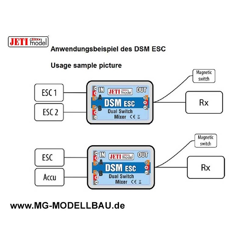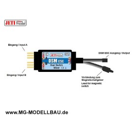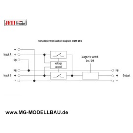 Das JETImodel DSM ESC versorgt die Empfangsanlage entweder über zwei BEC-Drehzahlsteller/Regler bzw. mit einer Kombination aus BEC-Drehzahlsteller/Regler und einem Stützakku. Es stellt also eine "Akku-Weiche" mit EIN/AUS Schalter da.