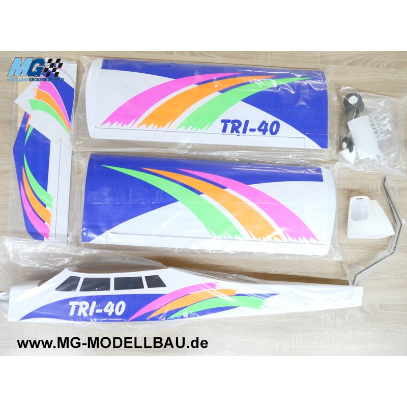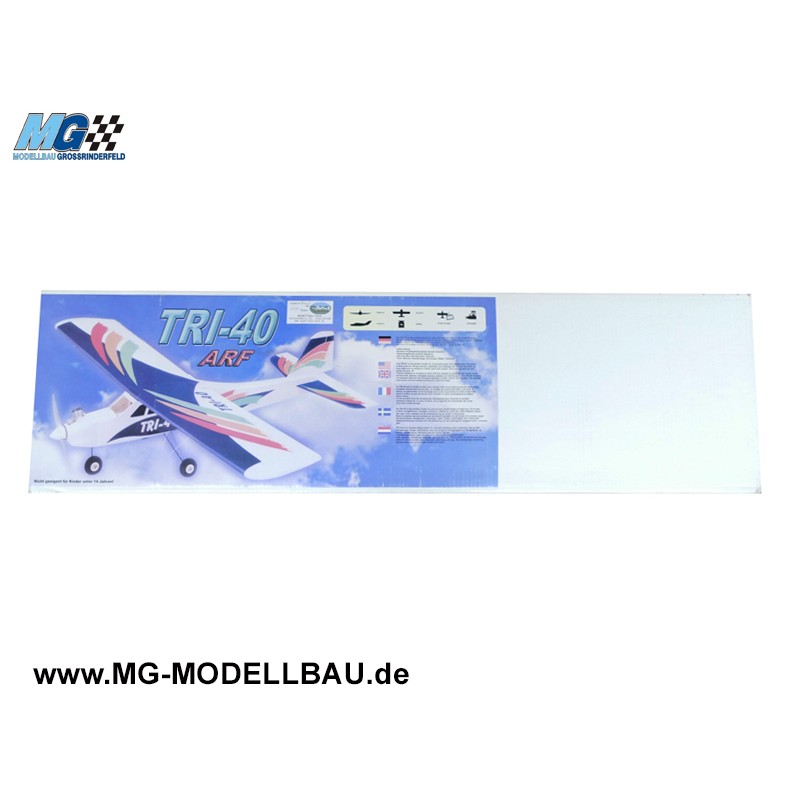 Die Tri 40 ARF ist ein Trainer aus Vollholz mit Hochdeckerkonstruktion, das für das Flugtraining bestimmt ist. Sie ermöglicht das Erlernen des Fliegens mit Querrudern und bietet dank ihrer Konstruktion gute Flugeigenschaften, die Anfängern einen problemlosen Übergang zur Steuerung in drei Achsen ermöglichen. Das Modell ist zu 90 % fertiggestellt, die Beklebung ist vollständig abgeschlossen. Um das Modell in Betrieb zu nehmen, müssen das Leitwerk, der Motor, die RC-Ausrüstung, die Zugstangen und das Fahrwerk montiert werden. Zum Fliegen ist eine mindestens 4-Kanal-RC-Ausrüstung erforderlich. Gesteuert werden Querruder, Richtung, Höhe und Motor.