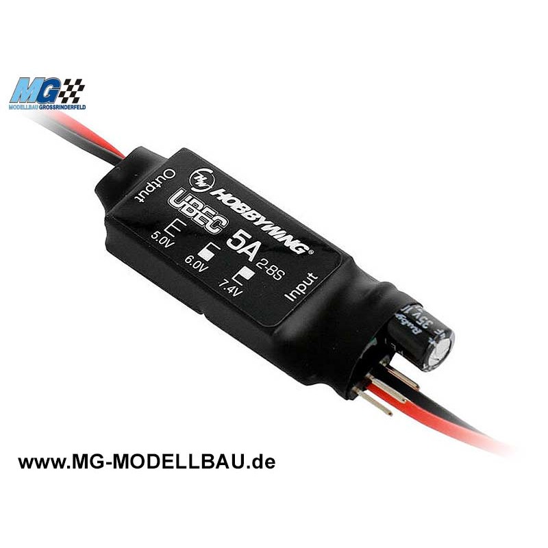 Dieser UBEC ist ein externer DC-Spannungsregler, der im Switch-Modus arbeitet. Seine Spannung zieht er sich aus 2-8S Lipos und liefert dabei kontinuierlich und stabil 5A Ausgangsstrom bzw. kurzzeitig sogar auch 15A. Auf diese Weise schafft es der UBEC den Strom für andere Geräte eines RC Modells bereitzustellen und eignet sich außerdem hervorragend für alle Starrflügler-Flugmodelle.