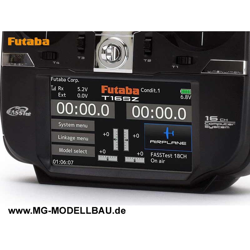 Der Sender verfügt über alle bekannten Modulationen wie T-FHSS, FASSTest, FASST und S-FHSS. Die Menüführung der Sendersoftware ist klar strukturiert und lässt sich über den großen, farbigen Touch-Screen intuitiv bedienen. Neben dem speziellen Multikopter-Menü verfügt die T16SZ über eine 9 sprachige Menüführung. Der integrierte SD-Card- Slot zur Speicherung der Modelldaten und zum Softwareupdate für zukünftige, neue Anwendungen macht dieses Fernsteuersystem zukunftssicher.