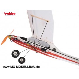 - Sperrholzteile wie Motorträger, Ruderhörner, Fahrwerksaufnahme, V-Verbinder und Strebenhalterungen für Tragflächenstreben.