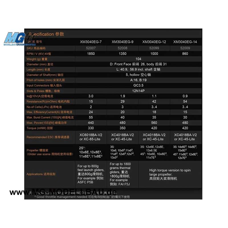 Serie "EG"/ "EGL" sind speziell für die Bedürfnisse des Elektrosegelflugs konzipiert. Die kleinsten Typen eigenen sich hervorragend die F5K, R.E.S, P5B u.ä. Anwendungen. Motoren mit langer Motorwelche für vorbildgetreue Segelflugmodelle sind ebenso erhältlich, wie Motoren im gekapselten Gehäuse für besonders schmale Rümpfe. "XM2833EGL" weist als Besonderheit eine Wellen-/Motorverlängerung in Form eines Getriebegehäuses auf. Dabei ist jedoch KEIN Getriebe integriert. Es dient lediglich dem vereinfachten Einbau in ultraschmalen Rümpfen.