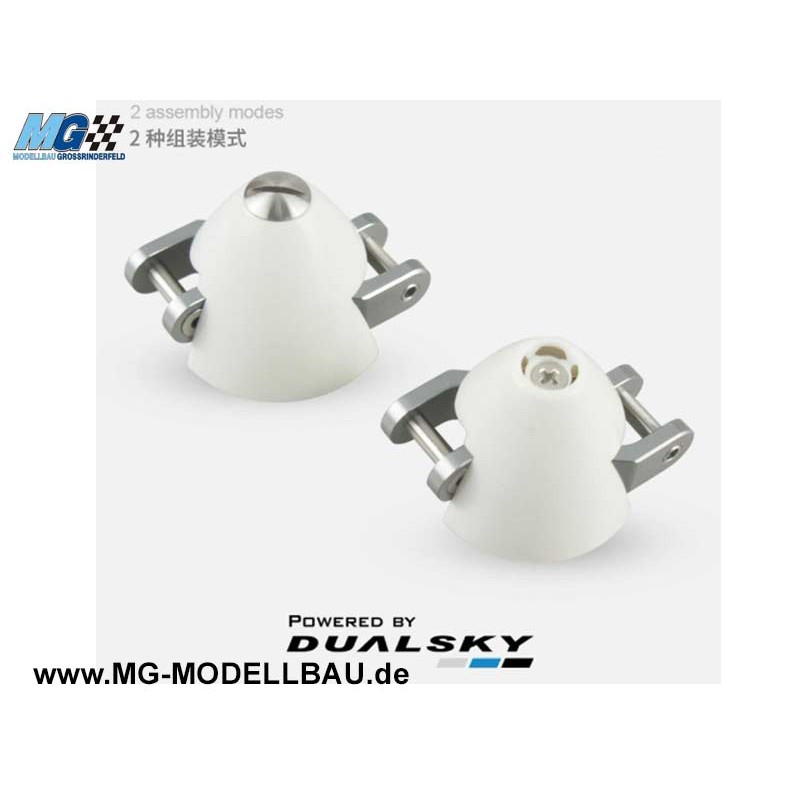 Die Type Z-Spinner von Dualsky ermöglichen ein engeres Anliegen der Klappluftschrauben am Rumpf und dadurch eine verbesserte Aerodynamik. Auch optisch fügt sich die Klappluftschraube dadurch formschöner in das Gesamtbild. Um den optimalen Vorteil dieses Spinnersystems zu erreichen, sind speziell für derartige Spinner vorgesehene Klappluftschrauben empfehlenswert. Normale Klappluftschrauben können ebenso montiert werden, stehen jedoch etwas weiter ab vom Rumpf. Durch ihre präzise Fertigung und Passform garantieren sie eine zuverlässige Funktion. Erhältlich in verschiedenen Spinnerdurchmessern und passend für nahezu alle am Markt befindlichen Motorwellenabmessungen. Neben Spinnerkappen sind alle anderen Teile dieses Spinnersystems ebenso als Ersatzteil erhältlich.