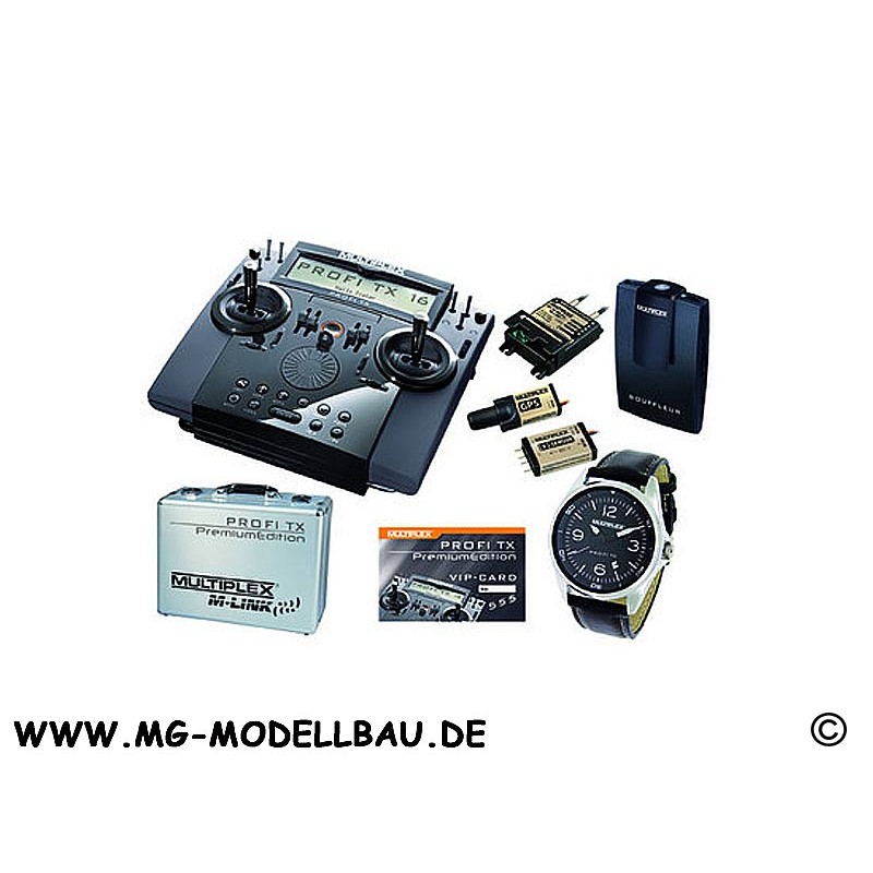 - Sender PROFI TX16 M-LINK Premium Edition" mit 16 Kanälen und 200 Modellspeichern; Sonderausstattung: Sender mit Seriennummer, eloxierte, goldfarbige Alu-Knüppelgriffe und zwei zusätzliche Schalter