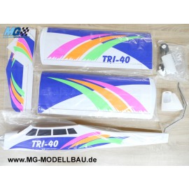 Die Tri 40 ARF ist ein Trainer aus Vollholz mit Hochdeckerkonstruktion, das für das Flugtraining bestimmt ist. Sie ermöglicht das Erlernen des Fliegens mit Querrudern und bietet dank ihrer Konstruktion gute Flugeigenschaften, die Anfängern einen problemlosen Übergang zur Steuerung in drei Achsen ermöglichen. Das Modell ist zu 90 % fertiggestellt, die Beklebung ist vollständig abgeschlossen. Um das Modell in Betrieb zu nehmen, müssen das Leitwerk, der Motor, die RC-Ausrüstung, die Zugstangen und das Fahrwerk montiert werden. Zum Fliegen ist eine mindestens 4-Kanal-RC-Ausrüstung erforderlich. Gesteuert werden Querruder, Richtung, Höhe und Motor.
