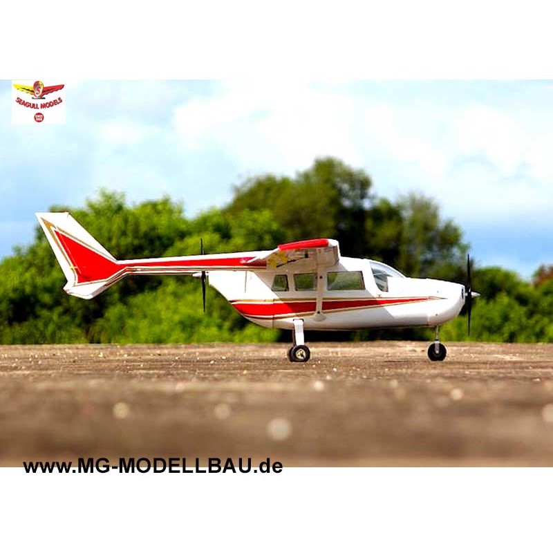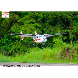 ARF-Bausatz für einen Halbmodellbau eines amerikanischen Zivil- und Reiseflugzeugs mit Hochdecker. Spannweite 195 cm, für zwei Zweitakt-Glühmotoren 6-7,5 cm³ (.36-.46 cu.in). Der Bausatz enthält einen Umrüstsatz für den Antrieb mit Elektromotoren 35 mm/830 U/min mit 4S-Lipo-Stromversorgung und 50-A-ESC.