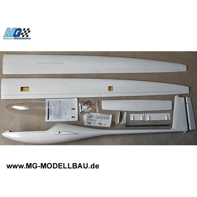 Dieser komplett aus Schalenbauweise in Negativformen gebaute Bausatz wird mit einem hochwertigen weißen Epoxy-Fiberglas-Rumpf geliefert. Unsere Diana-2 Rumpf ist verstarkt mit einem breite Kohlestreifen für mehr stabilität. Dabei ist das Tragflächerohr bereits einlaminiert und der Rumpf ist verstärkt mit Kohlefaserband. Die aus Fiberglas geformten und mit Kohlefaser verstärkten Tragflächen (D-Box) sind fertig zum Einbau der Servos. Als Bremsklappen sind mechanische Alu-Klappen verbaut. Alle Ruder sind als Elastic Flap ausgeführt. Für die Fertigstellung dieses Flugzeugs werden nur wenige Stunden benötigt. Eine ausführliche Bauanleitung und ein Hardware-Paket vervollständigen den Bausatz.