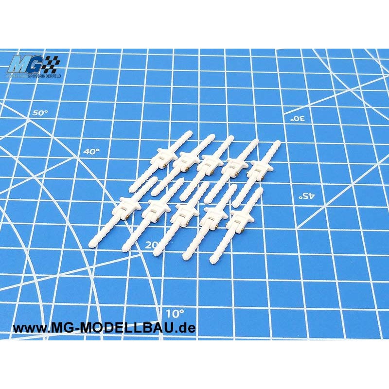 Aus schlagfestem Kunststoff, spielfrei zusammengenietet. Die raue Oberfläche verbessert die Klebstoffhaltung. Durch die Anschlagplatte ist gewährleistet, dass die Drehachse auch bei Einbau mehrerer Scharniere fluchtet. Seitliche Krallen sichern die Ruderscharniere gegen Verdrehen.