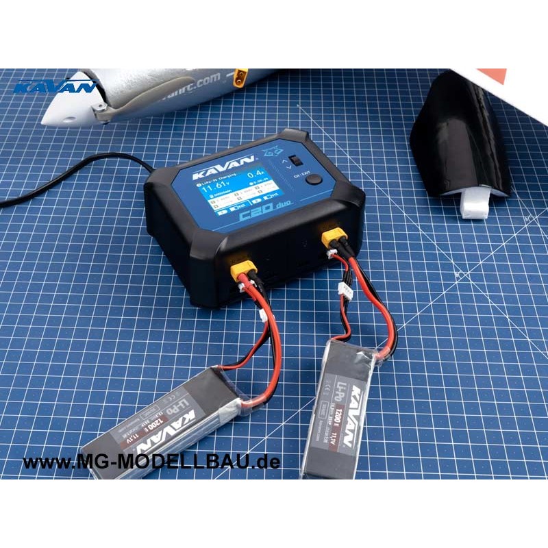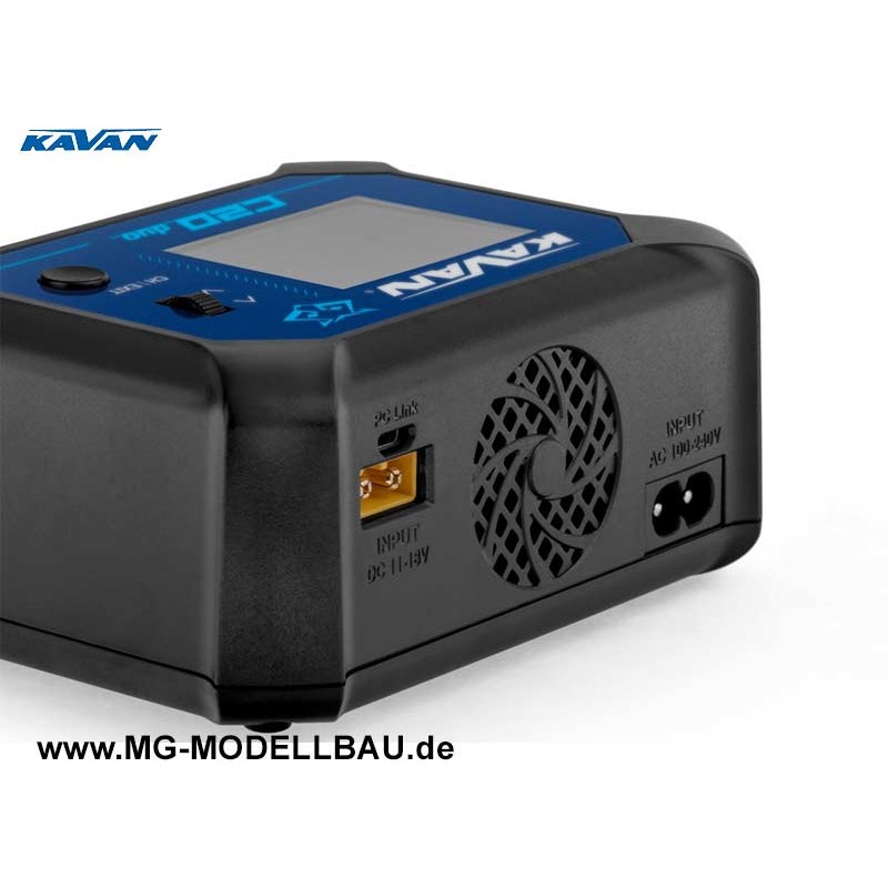 Das kleine 2-Kanal-Ladegerät KAVAN C20 Duo ist ein intelligentes Ladegerät mit Netz- wie auch Autobatterieversorgung und einer sehr einfachen und übersichtlichen Bedienung. Mit KAVAN C20 Duo können Sie übliche Zellentypen (NiCd, NiMH, LiPo, LiHV, ULiHV, Li-ion, LiFe, Pb) laden. Das Ladegerät ist darüber hinaus mit eingebauten 6-Kanal-Balancern ausgestattet, die ein sicheres Laden von Lithiumakkus sichern. Das Ladegerät ist mit einem LCD-Farbdisplay und einem Programmierrad/einer Programmiertaste ausgestattet, mit denen Sie die Parameter komfortabel und sehr übersichtlich einstellen und Laden steuern und überwachen können.