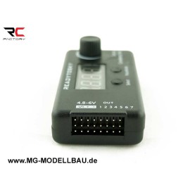 Kleiner digitaler Servotester. Der Tester erzeugt Impulse im Bereich von 800 bis 2200 µS. Schließen Sie den Servo an den Tester an und testen Sie dessen Bewegung. Der Tester unterstützt einen manuellen Modus, in dem Sie die Bewegung des Servos steuern können, einen Neutralmodus, in dem der Servo zentriert ist, und einen Automatikmodus, in dem sich der Servo selbst hin und her bewegt. Es können mehrere Servos gleichzeitig an den Tester angeschlossen werden. Der Tester ermöglicht es Ihnen, Ausgangssignale mit einer Frequenz von 50, 125 oder 250 Hz zu senden.