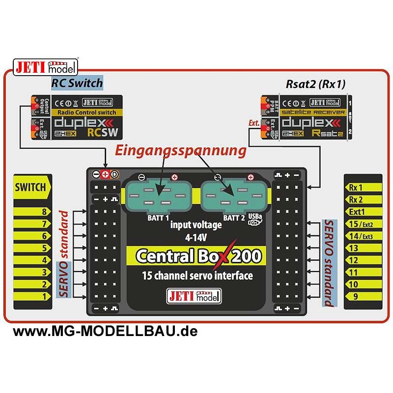 Geräte, wie z.B. die Central Box 200, haben einen speziellen Steckplatz für den RC switch. Verschiedene Geräte (mit magnetischen Schaltgeber, wie z.B. das MAX BEC 2D, DSM10