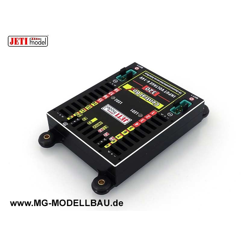 Die Central Box 320 wurde für ein umfassendes Management mehrerer Servos und zwei Empfängerakkus für ein Modell mit hohen Sicherheitsansprüchen entworfen. Die Central Box 320 hat einen Überlastschutz an jedem Servoausgang, 8 Kanäle für Hochleistungs-Servos bis 60Kg/cm und 10 Kanäle für Standard-Servos bis 30Kg/cm. Speziell für den Einsatz auch leistungsstarker und stromhungriger Servos wurde bei der Central Box 320 ein Aluminiumgehäuse für bessere Kühlung verwendet. Die Central Box 320 bietet echte Akku-Redundanz, DITEX-Servotelemetrie, JETI EX-Telemetrie und bis zu drei Empfängereingänge (2x 2,4GHz und 1x 900MHz) für vollständige Strom- und HF-Signalredundanz.