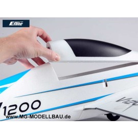 Speed- und Kunstflug-Enthusiasten werden die Stellgenauigkeit der sechs digitalen Metallgetriebe Servos und Kugelkopf-Anlenkungen lieben. Landeklappen verbessern die Langsamflugeigenschaften und ermöglichen kürzere Starts und Landungen. Das elektrische Einziehfahrwerk mit gefederten Drahtfahrwerksbeinen macht Starts und Landungen von Teer, unbefestigten Landebahnen und kurzem Gras möglich. Die schlanke Zelle ist durchgehend mit GFK Teilen verstärkt und das neue EPO mit höherer Dichte macht aus der V1200 ein robusteres und widerstandsfähigeres Modell mit glatterer Oberfläche. Ein kontrastreiches Farbschema mit kräftigen Kontrasten sorgt für bessere Sichtbarkeit und vereinfacht die Fluglagenerkennung. Für die Montage ist kein Kleber erforderlich, insgesamt nur sechs Schrauben werden für die Montage des Leitwerks und der einteiligen Tragfläche benötigt. Letztere lässt sich zum einfachen Transport und Lagerung leicht demontieren. Die Montage des V1200 dauert damit weniger lange als es dauert den Akku aufzuladen, damit Du schnell das unvergleichbare Flugerlebnis dieses Modells genießen kannst.