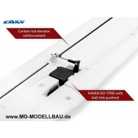 The fuselage of the model is made of the highly durable EPO foam (extruded polyolefin) with solid internal carbon fiber reinforcements. The C3548-750 brushless electric motor with an 11x8-inch folding propeller and a KAVAN R-50SB governor with a powerful BEC stabilizer required to power 4 powerful micro servos on board is installed in the bow. The cabin cover is removable and is attached with a pin at the front and a magnet at the rear. In the bow you will find enough space for a drive battery and a receiver. The rudder and elevator servos are located in the fin, and the rudders are controlled by short straight linkages.